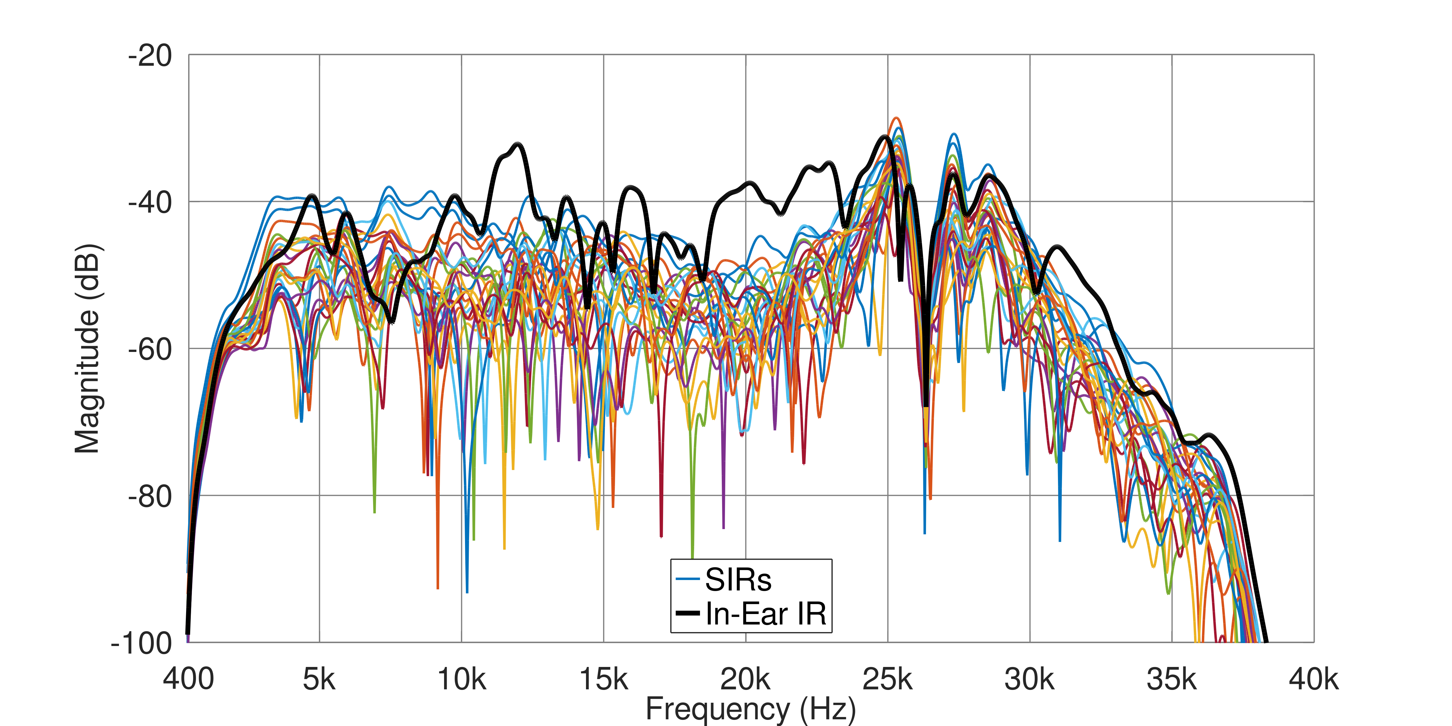 | Note: Sums of squared IRs at receivers (coloured dots) when one emitter is active (blue cross). The position of the in-ear microphone is indicative only as the actual position has not been recorded. |